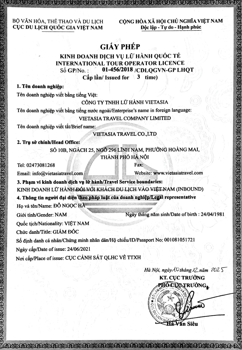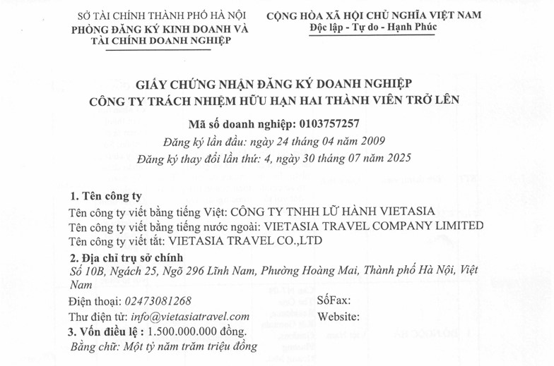 Company name (in Vietnamese): CÔNG TY TNHH Lá»® HÀNH VIETASIA